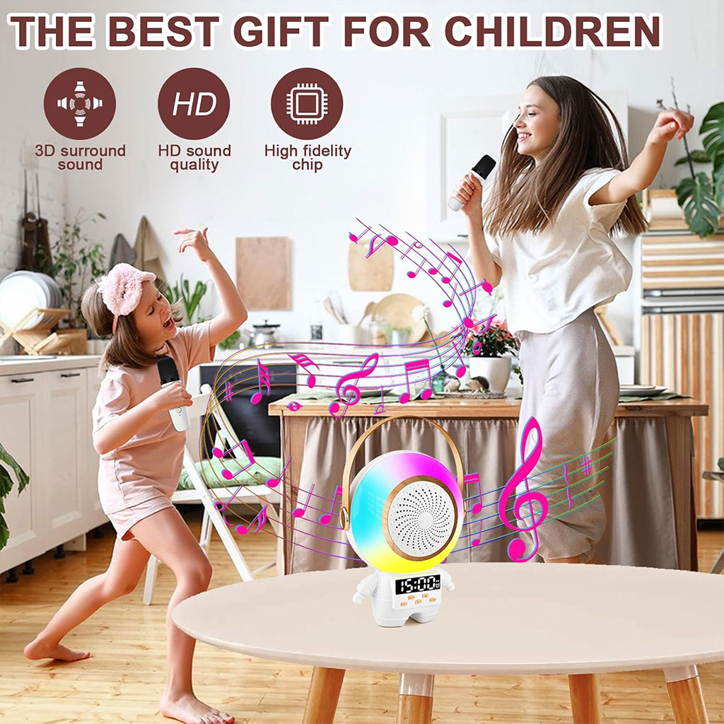 Design astronaute et micro : la mini machine de karaoké avec un design astronaute de rêve moderne et deux microphones sans fil. Le microphone sans fil karaoké utilise la dernière technologie de transmission sans fil pour transmettre efficacement votre voix. Lorsque le haut-parleur et le microphone sont allumés, le microphone se connecte automatiquement et a une portée de fonctionnement allant jusqu’à 33 pieds. Technologie avancée de réduction du bruit intelligente, processeur audio DSP professionnel, suppression du son originale en un clic【Machine de karaoké portable sans fil rechargeable】 : le haut-parleur est doté d’une sangle portable et robuste, léger et de petite taille, ce qui le rend facile à emporter partout, comme une fête d’anniversaire, une réunion, une salle de classe, des réunions de famille ou d’autres activités. Vous permet de passer un bon moment, de libérer le stress et d’ajouter de bons souvenirs.【Machine de karaoké multifonctionnelle】 : la machine de karaoké portable avec Bluetooth et microphone sans fil est construite avec la technologie Bluetooth 5.3, appairage instantané à vos appareils avec une grande stabilité. La machine de karaoké pour enfants est compatible avec divers appareils tels que les téléphones portables, iPad et PC. Il prend également en charge la carte TF, le Bluetooth, le port de sortie casque à l’arrière. Le micro sans fil se connectera automatiquement au haut-parleur lors de la mise sous tension, à une distance allant jusqu’à 32 pieds.【Réglage de l’horloge et du réveil】: Après la connexion Bluetooth, l’horloge se synchronise automatiquement avec l’heure du téléphone. Appuyez longuement sur « M » pour régler la partie horloge de l’alarme, puis appuyez longuement sur le bouton du téléphone pour régler la partie minute de l’alarme. Attendez 3 secondes pour que le réglage réussisse. Si vous souhaitez éteindre le réveil, appuyez longuement sur « M », l’écran d’alarme n’est pas allumé, c’est-à-dire que le réveil est éteint【Cadeau parfait】: Pour les amateurs de musique des enfants, ce haut-parleur à microphone est un bon partenaire pour chanter, c’est donc le meilleur cadeau. Un cadeau intéressant pour les enfants et vos amis qui aiment chanter et danser. Le design astronaute et la belle boîte d’emballage en font un cadeau d’anniversaire de Noël parfait pour la famille et les amis.